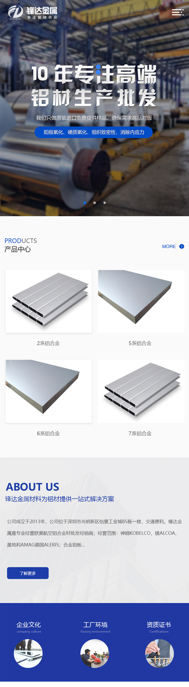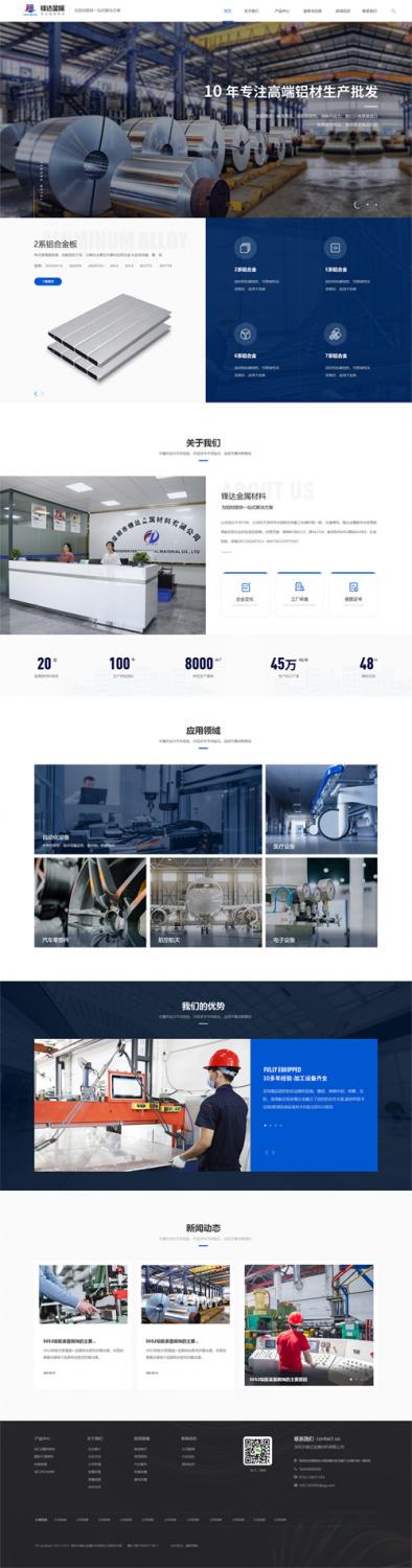 結(jié)合鋒達(dá)金屬的品牌元素和鋁材網(wǎng)站設(shè)計(jì)的風(fēng)格,整站采用了科技藍(lán)作為為主題色,網(wǎng)站風(fēng)格簡約厚重而不失科技感,符合鋁材網(wǎng)站制作行業(yè)特征及品牌的調(diào)性。