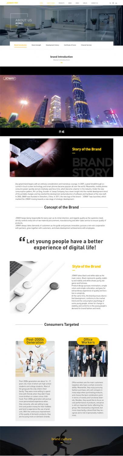 項(xiàng)目背景喬威電源成立于2004年,是一家數(shù)碼3C產(chǎn)品公司,現(xiàn)擁有一千多名員工 。網(wǎng)站定位以塑造企業(yè)形象及產(chǎn)品為導(dǎo)向結(jié)合移動(dòng)電源網(wǎng)站設(shè)計(jì)風(fēng)格,展開(kāi)整站的策劃設(shè)計(jì)