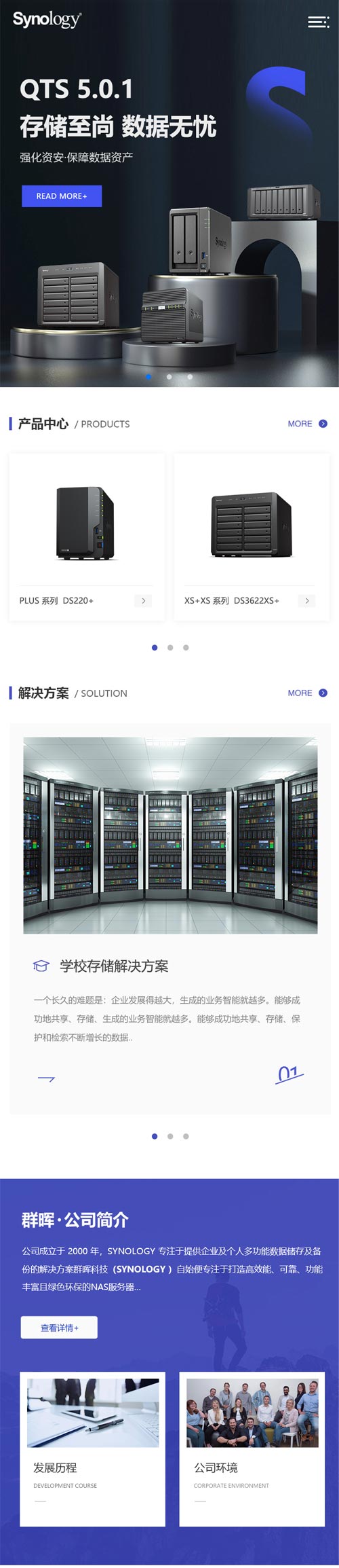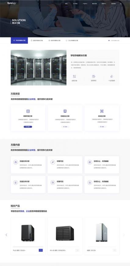 根據(jù)群暉科技的品牌屬性及產(chǎn)品特性采用科技藍(lán)為網(wǎng)站主題色,黑白灰為整站色系調(diào)性,既體現(xiàn)了企業(yè)產(chǎn)品特性網(wǎng)站簡約大氣厚重科技感滿滿,同時(shí)也體現(xiàn)了網(wǎng)絡(luò)存儲(chǔ)網(wǎng)站設(shè)計(jì)行業(yè)調(diào)性。