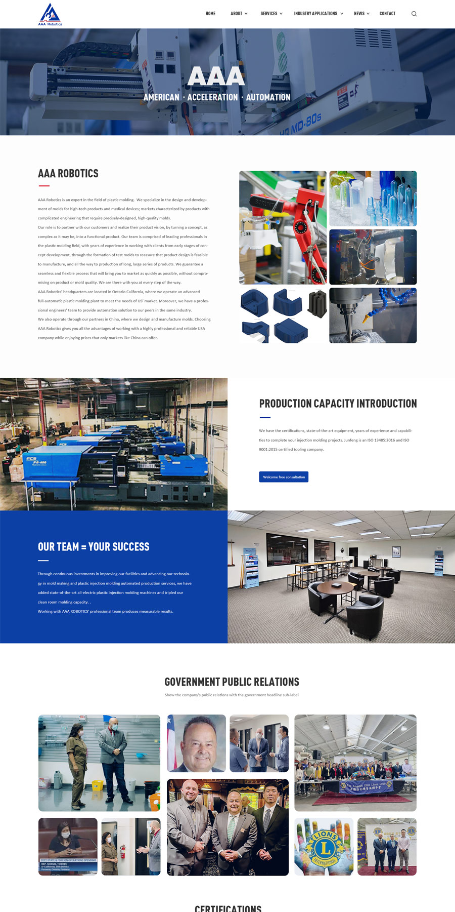 基于駿豐模具品牌元素及產(chǎn)品屬性采用科技藍(lán)為主色調(diào),在網(wǎng)站顏色上大面積整體色調(diào)采用了藍(lán)色調(diào),再用紅色調(diào)加以點(diǎn)綴,不僅讓網(wǎng)站視覺(jué)上更美觀大氣,且網(wǎng)站也不會(huì)顯得太過(guò)單調(diào)。