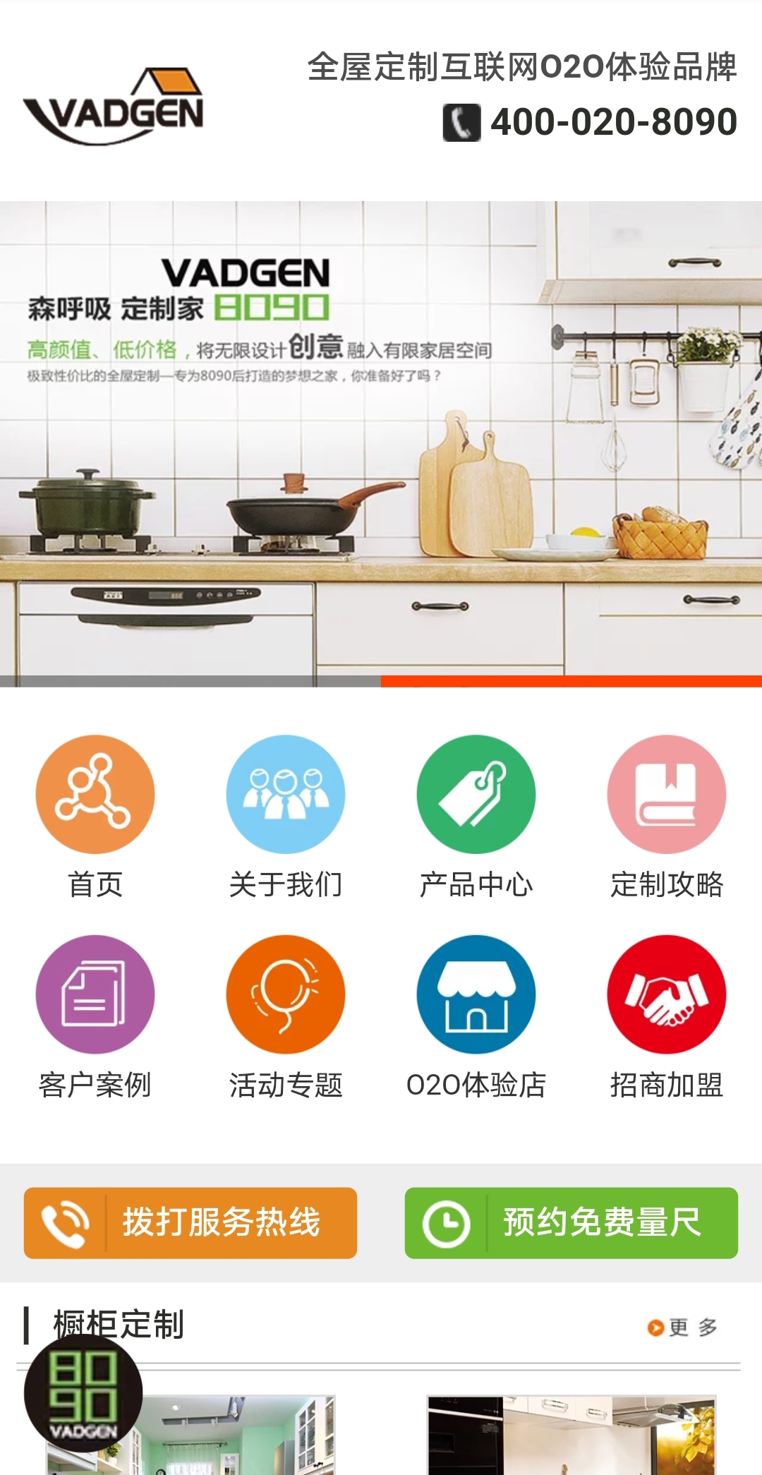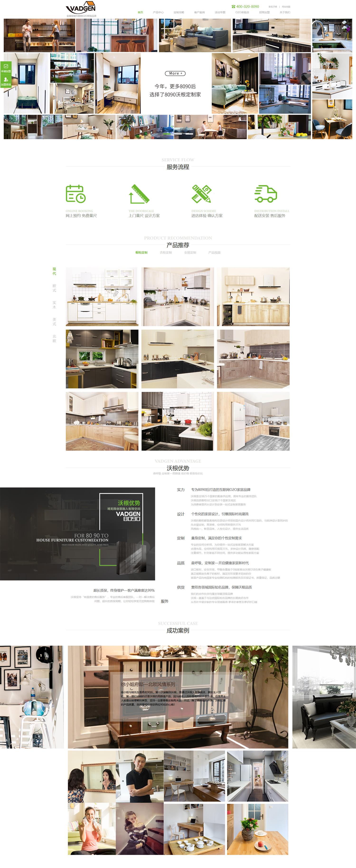 結(jié)合沃根的logo元素及櫥柜定制的行業(yè)屬性,將網(wǎng)站主色調(diào)定位環(huán)保綠,將白灰色作為輔助色,網(wǎng)站整體風格保持著時尚簡約的環(huán)保風格